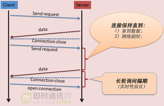 于是,一种被称为“短轮询”的数据获取模式出现了。在“短轮询”模式下,IM客户端定时轮询服务端,以便让用户知道是否有新的聊天消息存在。